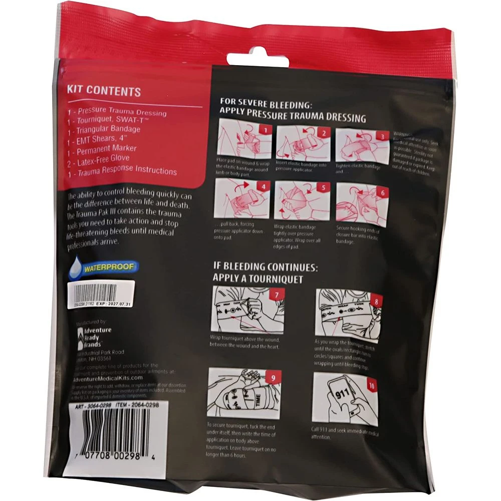 AMK’s most advanced trauma kit, the Trauma Pak III puts professional supplies in civilian hands, empowering you to take action to stop bleeding as it occurs. The waterproof, resealable trauma bag contains military-style tools and emergency essentials in a package compact and durable enough to keep in your glove box. Inside, you’ll find a pressure trauma dressing (Israeli Bandage), which combines gauze, trauma pad, and pressure applicator into one, easy-to-use emergency bandage, capable of providing up to 40 lbs. of direct pressure to stop bleeding fast and control most major bleeds. If bleeding continues, this bleeding control kit contains a windlass tourniquet. This well-known and combat-proven tourniquet, applied correctly, can help you control even arterial bleeds. Easy-to-follow instructions outline how to use the kit contents, with illustrations showing proper application of the dressing and tourniquet. This tactical trauma kit also includes a marker to write the tourniquet application time and Patient Assessment Form, EMT shears to cut through fabric, nitrile gloves for proper protection against blood borne pathogens, and a triangular bandage to stabilize limbs. Whether you’re looking for a bleed kit to add to your individual first aid kit (IFAK), first responder kit, range bag, or vehicle, the Trauma Pak III provides you with the professional tools you need to be safe and stop bleeding fast.