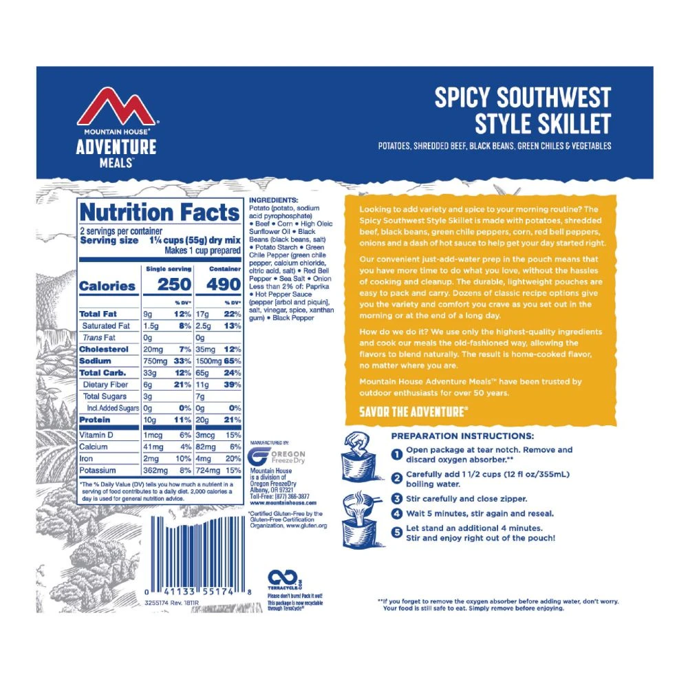 Whether you’re about to attempt El Cap or embark on a day hike through your favorite national park, you need two things out of your morning breakfast: Fuel and flavor. Mountain House Spicy Southwest Breakfast Hash offers both, thanks to a blend of shredded beef, hash browns, black beans, veggies and the perfect amount of hot sauce. Enjoy right from the pouch, mix it up with some eggs or add to tortillas for an extra-delicious start to your day.