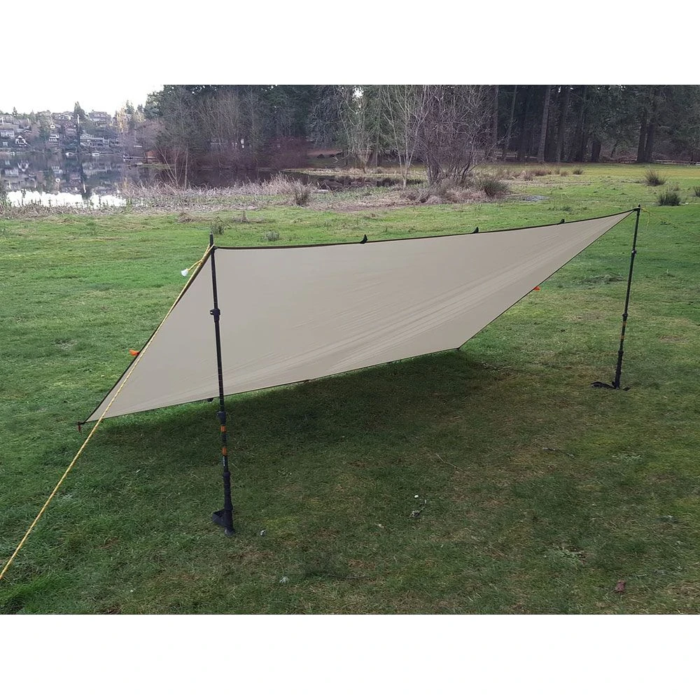 The SwitchBack Tarp is made from 1.9oz waterproof ripstop nylon or 1.1oz SilPoly. The overall measurements are 69″x120″